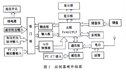 該終端控制器的硬件結(jié)構(gòu)如圖2所示,它的主體是一臺(tái)STD工控機(jī),采用模板式結(jié)構(gòu),便于故障檢修。供電線(xiàn)路的電壓、電流經(jīng)PT、CT變換后經(jīng)A/D轉(zhuǎn)換板轉(zhuǎn)變?yōu)閿?shù)字信號(hào)送至V40主板,PT、CT變比經(jīng)主臺(tái)設(shè)定后下發(fā)至該終端,CPU據(jù)此計(jì)算出線(xiàn)路的實(shí)際電壓、電流。脈沖電度表發(fā)出的脈沖信號(hào)經(jīng)輸入板送至CPU,根據(jù)電表脈沖常數(shù)計(jì)算出有功及無(wú)功功率。KG105型電臺(tái)接收主臺(tái)下發(fā)的指令,經(jīng)通訊板送至CPU,然后由輸出板控制輸出繼電器的動(dòng)作,進(jìn)而實(shí)現(xiàn)遙控跳合閘操作。遠(yuǎn)程抄表是由電臺(tái)經(jīng)通訊板采集威勝表中的數(shù)據(jù)實(shí)現(xiàn)的,而召測(cè)數(shù)據(jù)則是采集CPU中計(jì)算出的數(shù)據(jù)。CPU每隔1min采集1次數(shù)據(jù),所有計(jì)算結(jié)果保存在系統(tǒng)板上的SRAM中,可保存24小時(shí)的數(shù)據(jù),因此主臺(tái)第二天必須將第一天的數(shù)據(jù)召測(cè)回中心站的數(shù)據(jù)庫(kù)中,否則第一天的數(shù)據(jù)將丟失。
