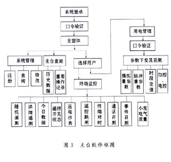 該無(wú)線(xiàn)電力負(fù)荷控制系統(tǒng)的管理軟件是用面向?qū)ο蟮木幊坦ぞ遃isualBasic6.0開(kāi)發(fā)完成的,系統(tǒng)軟件框圖如圖3所示。系統(tǒng)啟動(dòng)后要求輸入操作員工號(hào)及口令,驗(yàn)證無(wú)誤后連接電臺(tái),進(jìn)入主窗體。