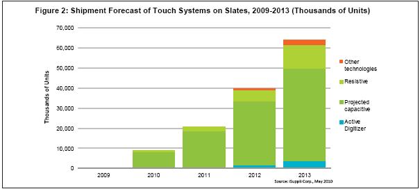 最近幾年,個(gè)人電腦市場(chǎng)對(duì)于觸摸屏的需求不斷增長,2008和2009年增長率超過20%,快于總體系統(tǒng)市場(chǎng)。但與該市場(chǎng)2010年462%的增長率相比,上述增長速度就相形見絀了。平板觸摸電腦是PC觸摸革命中的主要初期推動(dòng)者,預(yù)計(jì)占PC觸摸市場(chǎng)的比例將從2009年的3.8%銳升到56.2%,而總體PC觸摸市場(chǎng)規(guī)模將擴(kuò)大兩倍。