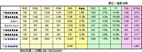 2010Q1由于全球景氣好轉(zhuǎn),再加上新興市場需求持續(xù)強(qiáng)勁,所以呈現(xiàn)淡季不淡之情況。2010年第一季臺(tái)灣整體IC產(chǎn)業(yè)產(chǎn)值(含設(shè)計(jì)、制造、封裝、測試)達(dá)新臺(tái)幣3,846億元,較上季(09Q4)成長1.8%,較去年同期(09Q1)成長88.9%。其中設(shè)計(jì)業(yè)產(chǎn)值為新臺(tái)幣1,036億元,較上季(09Q4)成長0.1%,較去年同期(09Q1)成長38.5%;制造業(yè)為新臺(tái)幣1,885億元,較上季(09Q4)衰退0.2%,較去年同期(09Q1)成長134.2%;封裝業(yè)為新臺(tái)幣640億元,較上季(09Q4)成長7.9%,較去年同期(09Q1)成長91.0%;測試業(yè)為新臺(tái)幣285億元,較上季(09Q4)成長8.4%,較去年同期(09Q1)成長92.6%。