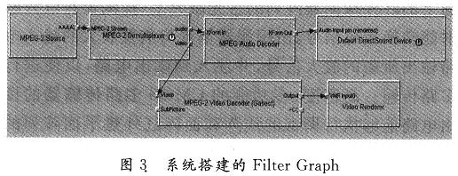 (2)搭建實時媒體播放器,將所接收到的TS碼流解碼播放。這是PC機應用程序的核心部分。在選擇搭建實時媒體播放器的策略上有兩種方法:一是利用開源的播放器進行修改,但絕大多數開源播放器都是基于Linux平臺下編寫的,要在Windows平臺下使用需要經過移植才行,移植工作量很大,且移植后播放器穩定性較難控制。另一個是基于DirectShow技術,自行編寫播放器。DirectShow是微軟DirectX家族中的成員,與Windows有著天然的“血緣”關系,是Windows平臺下搭建媒體播放器的最佳選擇。并且微軟提供了相應的開發套件,使得開發工作量得以減少,開發周期大大縮短。基于以上原因,本方案選擇基于DirectShow技術搭建實時媒體播放器。