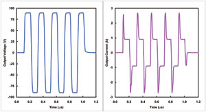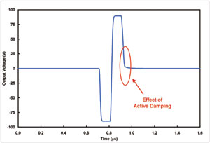 我們可以直觀地理解超聲波發送器輸出的對稱性要求。然而,這里需要深入理解的是輸出信號不必為一個長脈沖群。它可能包括一個單正極和負極脈沖對,脈沖對的前后均為0V。同樣,信號歸至0V的質量變得至關重要。有時,它被稱為“阻尼”函數(見圖3),并對一些超聲波模式產生巨大的影響,例如,人體非線性為主要信息源的諧波成像等。