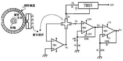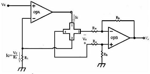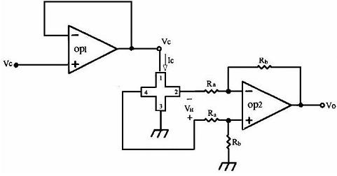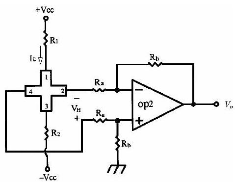 磁場強度可利用形成在結晶片的一部份的霍爾組件變換成電氣信號(參照前述霍爾組件的作用原理)。結晶通常使用半導體硅,霍爾組件的磁場靈敏度為10~20mV/K.Oe。此信號經形成在同一結晶中的信號處理電路放大后,作為適合所定目的的信號電壓被取出。通常四根導線中的兩根連接于一方接地的電源,而從剩下的兩根的一根取出正極性的信號電壓,并從另一根取出負極性的信號電壓?;魻柦M件的輸入電阻通常需符合信號處理電路的電源,以便可利用定電壓使用霍爾組件。此時組件的輸出電壓不管在N型或P型均無大差異。又因輸出電壓與電子或正孔的移動度成正比,故溫度特性也應該盡量保持一定,這是與單體霍爾組件不同的地方。