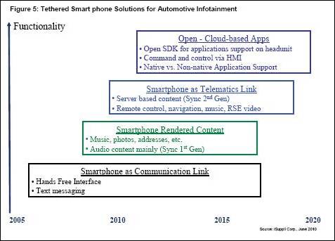 從信息娛樂角度來看,iSuppli公司認(rèn)為將轉(zhuǎn)向分層式軟件架構(gòu),設(shè)備在整體產(chǎn)品壽命期內(nèi)不被鎖定。通過Genivi、Android或Windows Embedded Automotive實(shí)現(xiàn)的本地應(yīng)用支持,提供支持這種功能的靈活性。iSuppli公司還認(rèn)為,Terminal模式將在市場上火起來,盡管面臨挑戰(zhàn)。在中間,有一類通過定制軟件接口運(yùn)行的非本地應(yīng)用,如福特的Sync,或者家中眾多其它的連網(wǎng)設(shè)備。