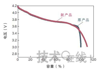 新產品的最大特點是,具有與原有鋰離子充電電池幾乎相同的放電曲線,并且實現了高容量化(圖1)。由于充電電壓和工作電壓與原來的鋰離子充電電池相同,因此產品廠商無需改變產品的電源系統即可利用。