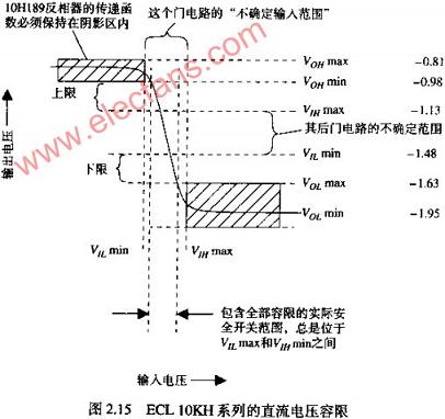 圖2.15舉例說(shuō)明了MOTOROLA10KH射極耦合邏輯門電路在25℃環(huán)境溫度條件下的電壓容限,這此邏輯門電路都是對(duì)輸入電壓敏感,保證0和1轉(zhuǎn)換的電壓門限在圖中以VOLMIN和VIHMAX數(shù)值形式表示。接收到的電壓低于VILMIN則保證為邏輯0響應(yīng),高于VMMAX則保證為邏輯1響應(yīng)。落在兩個(gè)門限之間的接收電壓可能被接收電路判決為1,也可能為0,或者為一個(gè)不確定狀態(tài)。