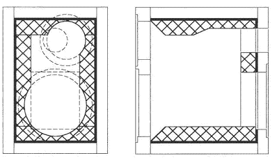 本音箱的箱體制作比較簡單,只需按圖6所示將.6塊具有相應(yīng)開口的箱板緊固在一起即可,無需使用加強板或支柱。高音單元裝在偏離面板中央的位置和前面板兩側(cè)倒成圓角是為了獲得正確輻射方向因而采取的措施。此外,與通常的做法相比,低音反射口不是位于前面板而是位于箱體背后。該反射口內(nèi)接的出聲管可用直徑35mm、長123mm稍具錐度的聚氯乙烯塑料管制成。