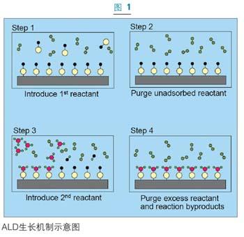 ALD的基本步驟如圖一所示。這種淀積過程是在經過活性表面處理的襯底上進行的。首先將第一種反應物引入反應室使之發生化學吸附,直至襯底表面達到飽和。過剩的反應物則被從系統中抽出清除,然后將第二種反應物放入反應室,使之和襯底上被吸附的物質發生反應。剩余的反應物和反應副產品將再次通過泵抽或惰性氣體清除的方法清除干凈。這樣就可得到目標化合物的單層飽和表面。這種ALD的循環可實現一層接一層的生長從而可以實現對淀積厚度的精確控制。