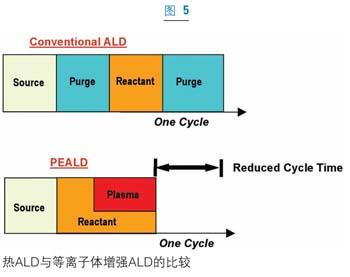 雖然ALD最初僅被視為一個純粹的熱工藝,但是對基本的原子層淀積循環的微小變更已經提出了多年。最常見的變種是等離子體增強原子層沉積工藝(PEALD)。PEALD可取消原子層淀積中的一個步驟,從而進一步縮短生產周期。PEALD過程中,在淀積溫度下互不發生反應的互補反應源在同一時間被引入到反應室,然后反應源關閉并凈化反應室,接著施加一個直接的等離子脈沖,這個等離子體環境產生高活性自由基并與吸附于襯底的反應物反應。關閉等離子可迅速清除活性自由基源,反應室中一直流過的清潔氣體將清除過剩自由基和反應副產物(圖5)。除了較高的生長速度和較短的周期時間,PEALD薄膜表現出比傳統的原子層淀積薄膜更高的密度和更高的擊穿電壓。該技術已經在多個應用中取得了發展,如DRAM、MIM和eDRAM電介質薄膜。不過在一些關鍵的薄膜應用中,如高功率柵介質,等離子損傷以及界面氧化的顧慮阻礙了PEALD技術的廣泛應用。