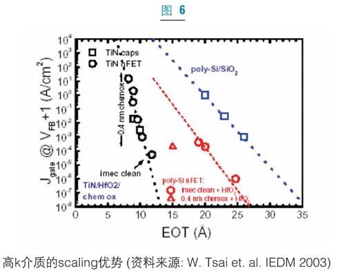 當高k材料替代二氧化硅材料后,金屬柵必須取代傳統的多晶硅柵以充分實現電學優勢。由于費米能級釘扎效應,多晶硅耗盡和化學不穩定性,多晶硅柵電極已被發現與高k柵介質不兼容。圖6顯示了二氧化硅(SiO2)和二氧化鉿(HfO2)柵介質的柵級漏電流比較。在相同的等效氧化層厚度(EOT)下,HfO2/TiN柵堆的柵漏電流要比傳統的SiO2/Poly-Si柵堆的柵漏電流小好幾個數量級。