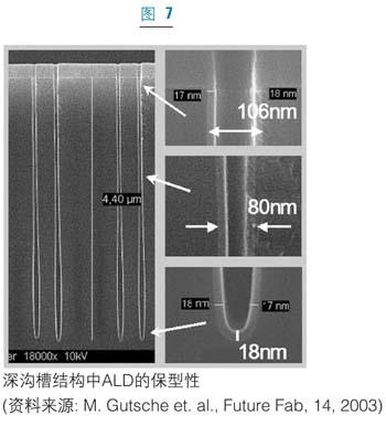 最近,Al2O3/HfO2以及Al2O3/ZrO2結構也引起了人們的關注。PEALD也已經用于eDRAM中。電容滿足所有的要求,即等效氧化層厚度要小于8埃,125攝氏度時漏電流要小于1fA/cell,工作電壓為1伏時壽命要大于十年。圖7為典型的ALD薄膜在深槽結構的保角性和動態存儲器生產中的半球形硅晶結構,金屬ALD薄膜,例如氮化鈦(TiN)也廣泛應用于動態存儲器制造中的電容電極。