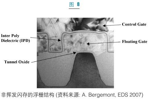 在非揮發性存儲器的應用中,人們也開始研究ALD在介質和金屬淀積中的應用。閃存技術主要由浮柵(floatinggate)技術主導(圖8)。高k電介質目前正被研究作為二氧化硅(SiO2)和氮化硅(Si3N4)柵介質的替代品,以改善浮柵和控制柵之間的電容耦合率。到2010年,浮柵技術可望被一些技術所取代,例如電荷捕獲存儲器(TANOS,NROM),相變存儲器(PCM)、鐵電記憶體(存儲器),三維堆疊式存儲器也正在研究中。ALD已被用作這些技術的阻擋層和擴散阻擋層。