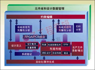 圖1表明了一個典型的由前端到后端的綜合系統(tǒng)設計。它始于設計定義(原理圖輸入),該設計定義與約束編輯緊密集合在一起。在約束編輯中,設計者既可定義物理約束又可定義電氣約束。電氣約束將為網(wǎng)絡驗證驅動仿真器進行布局前和布局后分析。仔細看看設計定義,它還與FPGA/PCB集成相鏈接。FPGA/PCB集成的目的是為了提供雙向集成、數(shù)據(jù)管理和在FPGA與PCB之間執(zhí)行協(xié)同設計的能力。