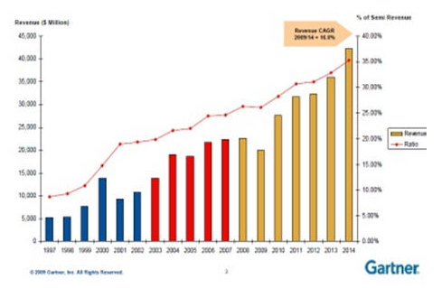 按Gartner副總裁Dean Freeman看法,能進行先進制程設計的fabless公司目前正處于極好時光。因為Freeman看到頂級代工廠正義無反顧的向40及28nm進軍,同時為爭奪更大的市場份額,而使硅片代工的價格迅速下降。
