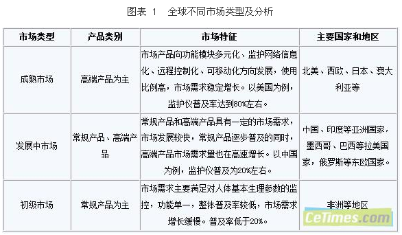 醫(yī)療設備的發(fā)展與國家和地區(qū)的經濟發(fā)展水平、醫(yī)療政策以及當地居民收入水平息息相關,這些因素導致全球醫(yī)療監(jiān)護儀市場發(fā)展不平。根據市場特征以及對產品需求的不同可以將醫(yī)療監(jiān)護儀市場分為成熟市場、發(fā)展中市場和初級市場。