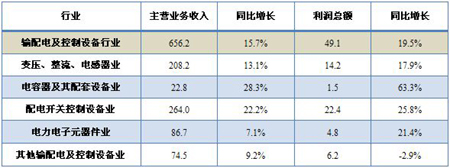 表:輸配電及控制設(shè)備行業(yè)及其子行業(yè)主營業(yè)務(wù)收入和利潤總額(單位:十億元)