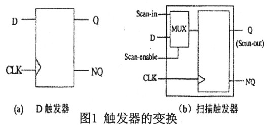 假設電路中的時序元件是由圖1(a)所示的D觸發器組成,寄存器變化法就是將此D觸發器轉化成圖1(b)所示的具有掃描功能的觸發器。從圖中可以看出掃描觸發器主要是在原觸發器的D輸入端增加了一個多路選擇器,通過掃描控制信號(Scan—enable)來選擇觸發器的輸入數據是正常工作時的輸入信號(D)還是測試掃描數據(Scan—in)。