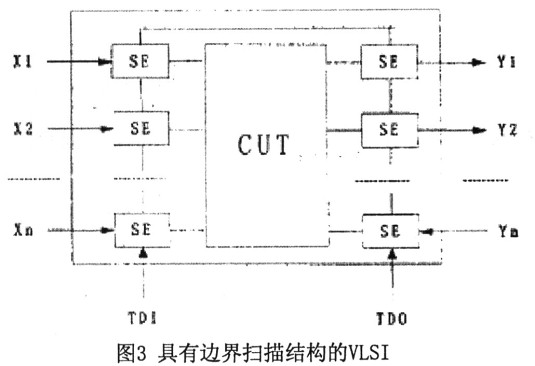 邊界掃描的基本思想是在靠近待測器件的每一個輸入/輸出管腳處增加一個邊緣掃描單元,并把這些單元連接成掃描鏈,運用掃描測試原理觀察并控制待測器件邊界的信號。在圖3中,與輸入節點X1,X2…、Xm和輸出節點Y1,Y2…、Ym連接的SE即為邊界掃描單元,它們構成一條掃描鏈(稱為邊界掃描寄存器一BSR),其輸入為TDI(TestDataInput),輸出TD0(TestData0ut)。在測試時由BSR串行地存儲和讀出測試數據。此外,還需要兩個測試控制信號:測試方式選擇(TestModeSelect—TMS)和測試時鐘(TestC1ock—TCK)來控制測試方式的選擇。