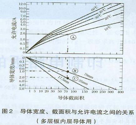 值得注意的是,當(dāng)導(dǎo)體圖形溫度上升到85℃左右時(shí),絕緣材料自身開始發(fā)黃(圖1),電流繼續(xù)通過,最后銅圖形熔斷,特別是多層板內(nèi)層圖形,周圍都是傳熱性差的樹脂,散熱困難,因而溫度不可避免地上升,所以特別要注意導(dǎo)體圖形線寬的設(shè)計(jì)。實(shí)際上在進(jìn)行PCB布線設(shè)計(jì)時(shí)走線線寬主要依據(jù)其發(fā)熱量和散熱環(huán)境來確定的。銅導(dǎo)體的截面積決定了導(dǎo)線電阻(數(shù)字電路中線電阻引起的信號(hào)損耗可忽略不計(jì)),銅導(dǎo)體和絕緣基材的導(dǎo)熱率影響溫升,進(jìn)而決定載流量。圖2是普通FR-4覆銅箔板銅導(dǎo)體圖形線寬及截面積與允許電流之間的關(guān)系圖。從圖中可以看出:導(dǎo)體圖形截面積一定,當(dāng)其允許電流值為2A,溫度上升值低于10℃時(shí),對于35Um銅箔,其線寬應(yīng)設(shè)計(jì)為2mm:對于70um銅箔,其線寬應(yīng)設(shè)計(jì)為lmm。由此得出:當(dāng)導(dǎo)體的截面積、允許電流和溫度上升值一定時(shí),可通過增加銅箔厚度或加大線寬值兩個(gè)方面來滿足走線的散熱要求。
