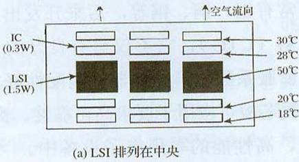 熱性能相同發(fā)熱元器件布置:圖5顯示PCB上安裝IC(0.3W),LSI(1.5W)時(shí)溫度上升的實(shí)測值。按圖5(a)排列,IC的溫度上升值是18℃-30℃,LSI溫度上升值是50℃。按圖5(b)排列,LSI溫度上升值是40℃,比圖5(a)排列還要低10℃。