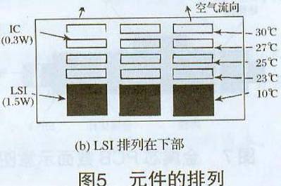當(dāng)熱性能不同的元件混合安裝時(shí),最好將發(fā)熱量大的元件安裝在下風(fēng)處,放熱小的元件安裝在上風(fēng)處。圖4顯示元件的常規(guī)排列,圖4(b)是將發(fā)熱大的元件安裝在上風(fēng)處,發(fā)熱小的元件(C、IC等)安裝在下風(fēng)處,這樣耐熱差的元件會(huì)處在發(fā)元件散熱的路徑上,其結(jié)果是耐熱性差的元件處較高溫度處。所以,元件最好按圖4(a)排列,實(shí)際上,導(dǎo)體圖形設(shè)計(jì)要達(dá)到圖4(a)的理想排列仍有困難。