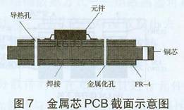 金屬板嵌入多層印制板的中間,其典型結(jié)構(gòu)如圖7金屬芯板本身也可作為地層使用,其上下層可通過金屬化孔(與芯板絕緣)互聯(lián),并通過導(dǎo)熱孔實(shí)現(xiàn)熱量在金屬芯板內(nèi)層和表面的傳遞。如圖7所示,發(fā)熱元件可通過底部和導(dǎo)熱孔直接焊接在板面上,發(fā)熱器件產(chǎn)生的熱直接傳遞到金屬芯板,由金屬芯板經(jīng)導(dǎo)熱孔傳給接觸的安裝機(jī)箱而散發(fā)出去;熱量較大時(shí)可銑去芯板兩邊的絕緣層,通過邊緣裸露的金屬芯板與機(jī)座接觸散熱,因此具有良好的散熱效果。對處于密閉機(jī)箱中的電路散熱是一種較好的選擇金屬芯PCB的芯材通常有鋁、銅、鋼等,后來開發(fā)出了覆銅因瓦復(fù)合材料(CIC),它不僅具有良好的導(dǎo)熱性,而且其熱膨脹系數(shù)與半導(dǎo)體器件匹配性好,所制成的CIC金屬芯板可應(yīng)用于要求高可靠性、高組裝密度、高功率、高性能的軍用電子設(shè)備中。