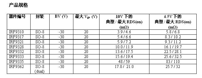 全球功率半導(dǎo)體和管理方案領(lǐng)導(dǎo)廠商 – 國際整流器公司 (International Rectifier,簡(jiǎn)稱IR) 推出新系列-30 V器件,采用 IR最新的SO-8封裝 P 溝道 MOSFET硅組件,適用于電池充電和放電開關(guān),以及直流應(yīng)用的系統(tǒng)/負(fù)載開關(guān)。新款 P 溝道器件的導(dǎo)通電阻 (RDS (on)) 為 4.6 m?至59 m?,可匹配廣泛的功率要求。P 溝道 MOSFET 無需使用電平轉(zhuǎn)換或充電泵電路,使其成為系統(tǒng)/負(fù)載開關(guān)應(yīng)用非常理想的解決方案。
