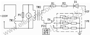 圖中TM1為調(diào)壓器,TM2為高壓變壓器,TM2產(chǎn)生的高壓經(jīng)高壓二極管D1整流得到0~3萬伏(峰值電壓)的直流高壓。高壓電阻R1、R2為限流電阻,我們以電壓表V來間接指示實際的高壓值,也就是以高壓變壓器TM1初級的低壓送入電壓表,其表頭上指示的電壓數(shù)值是根據(jù)高壓變壓器初、次關(guān)系換算后的高壓值。這樣處理既可節(jié)約成本又可保證安全。本設(shè)備將P21點電壓送至另一比較環(huán)節(jié),此電壓與設(shè)定的泄漏電流比較來控制是否聲光報警,以此剔除不合格品。由于電池殼的材質(zhì)略有不同,空氣濕度也有變化,各種因素都可能引起合格電池殼情況下P21點的電壓發(fā)生微小變化,這種變化已足以導致設(shè)備誤判斷。為了解決這種問題,我們在主回路中串入了不同的電阻(虛線框中),以調(diào)節(jié)旋鈕SA來作出選擇,用以抵消各種影響,可避免設(shè)備的誤判斷。