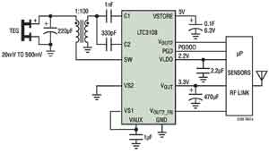 迄今為止,高集成度DC/DC升壓型轉(zhuǎn)換器一直比較缺少,這類轉(zhuǎn)換器可以收集和管理由極低的輸入電壓源提供的多余能量。不過,LTC3108極大地簡化了收集和管理由極低輸入電壓源提供的多余能量的任務(wù)。其升壓型拓?fù)湓谳斎腚妷旱椭?0mV時仍能正常運(yùn)行。這具有重大意義,因為它允許LTC3108從低至1℃的溫度變化中收集TEG提供的能量。