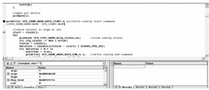 以配置開始指令的發(fā)送為例,從圖3圖4兩圖中可以看出軟硬件交互過程中的指令發(fā)送方式,在VC++中單步調(diào)試,發(fā)送一個開始指令0x01到配置命令寄存器地址0x01,通過硬件模塊的接口動作,用嵌入式存儲器SignalTapII中捕捉到LA的數(shù)據(jù)為1h,LD上的數(shù)據(jù)為1h后ConfigStart寄存器置高,配置開始。