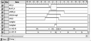 圖4中ADS_N、BLAST_N、LWORD_N、LHOLD、LHOLDA是LocalBus的接口信號,ConfigEnd和ConfigStart是分別代表配置結(jié)束和配置開始的標(biāo)志寄存器,LA是接口的地址信號,用于模塊中控制寄存器的尋址,LD是接口的數(shù)據(jù)信號,用于指令數(shù)據(jù)的發(fā)送和數(shù)據(jù)的回收。