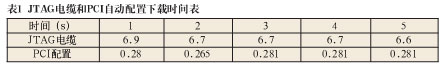 為了對比基于PCI總線的FPGA高速配置方案與基于ByteBlasterIIJTAG下載電纜的速度性能,首先使用QuartusII7.1軟件采用JTAG方式對FPGA2配置5次,計(jì)算每次下載所示時間,得到如表1中所示的數(shù)據(jù);再使用本系統(tǒng)中基于PCI總線的配置功能對FPGA2配置5次,軟件會自行計(jì)算總的下載時間,得到如表1中所示的數(shù)據(jù):