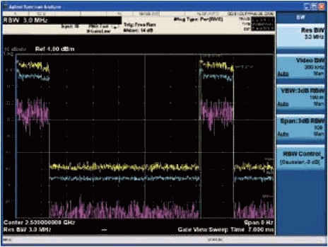 圖5圖中的信道功率測量僅顯示了前導碼的選通有了穩定的觸發,頻譜分析儀就可以啟動掃描測量;
