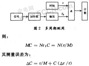 觸發(fā)誤差的抑制傳感器輸出的信號為矩形波信號由原始振蕩信號經整形得到,信號中疊加的噪聲在整形時會使矩形波信號的觸發(fā)沿提前或滯后。多周期測周時使相鄰周期的觸發(fā)誤差相互抵消。M個周期的累計觸發(fā)誤差只相當于單個周期的觸發(fā)誤差。