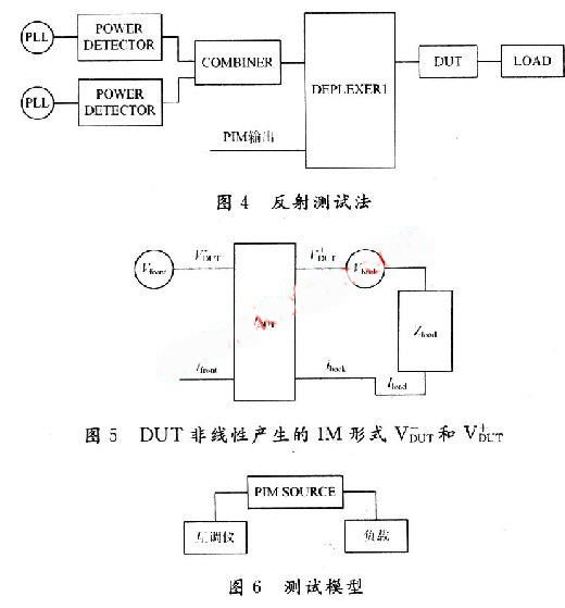 該系統中兩個大功率載頻f1和f2通過雙工濾波器發射到DUT,終端接50 Ω負載。PIM產生的雜散信號在DUT中產生,并在兩個方向傳播——“前向”到匹配負載,“反向”到雙工濾波器。發射激勵信號的頻率和被測的IM產物的頻 率由雙工濾波器的TX和RX通道決定。接收機測量反向傳播的IM波功率。