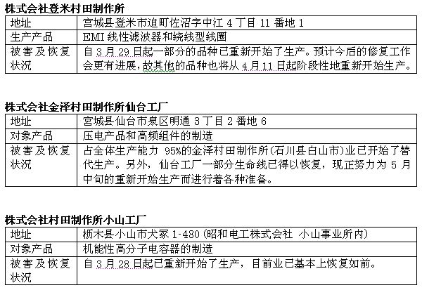 在之前,本網站曾報道過,截至23日18時,日本東部大地震對日本村田制作所位于宮城縣和櫪木縣的三個受災工廠的破壞程度。今天日本村田制作所再次發表聲明,告知三個受災工廠的恢復程度。