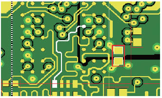 發(fā)射或者耦合是由某些幾何規(guī)則相違背造成的。例如,考慮電流回流的路徑,每一個(gè)信號(hào)都有一條信號(hào)軌跡預(yù)置好的路徑,但是在電源層和接地層經(jīng)常有回路出現(xiàn)。回路電流總是選擇電阻最小的路徑;同時(shí)在高頻條件下,選擇阻抗最低的路徑。這種新軟件可以確定哪條返回路徑是不連續(xù)的。例如,這個(gè)路徑有可能由于分離的平面而被中斷。如果回路在幾何位置上不能跟隨信號(hào)路徑,那么回路電流則會(huì)使用一條不同的路徑。依賴于回路電流周圍區(qū)域的大小,會(huì)出現(xiàn)一個(gè)天線輻射或接收干擾信號(hào),導(dǎo)致EMC符合性的失敗或者可能的設(shè)計(jì)故障。這個(gè)軟件工具識(shí)別電源供電層中這樣不連續(xù)的銅對(duì)高頻來(lái)說(shuō)是否由一個(gè)或者多個(gè)電容器相連結(jié)(如圖1)。那些電容器會(huì)形成一條對(duì)回路電流有著低阻抗的路徑,從而避免不希望的回路。
