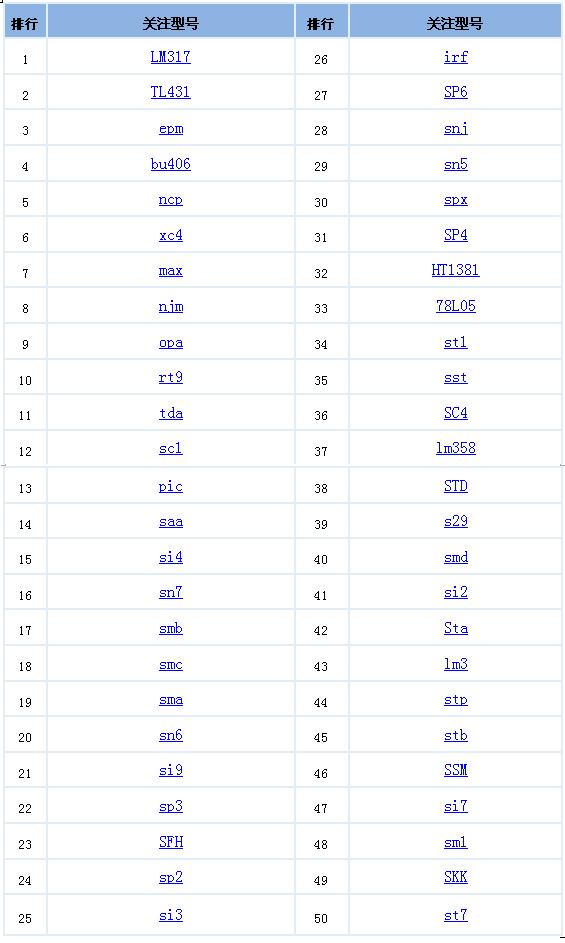 各位商戶你們有福啦!從這月起,《華強電子》的小編們會定期從市場搜集熱門型號和廣大采購者經常詢價的產品型號的前五十名,以供大家參考,如果我們的跑堂能給廣大商家帶來一點生意上的幫助,再辛苦也值得。如果您有這方面的需求或者建議,歡迎來電咨詢。