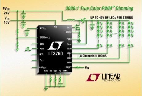 凌力爾特公司 (Linear Technology Corporation) 推出8通道LED驅動器LT3760,該器件采用一個升壓型DC/DC控制器,每個通道能驅動高達45V的100mA LED 串。其內部60V、1MHz DC/DC升壓型控制器設計成面向多達80個白光LED的恒定電流LED驅動器。LT3760用一個12V輸入可以驅動8個通道,每通道多達10個串聯(lián)的100mA 白光LED,同時提供超過92% 的效率。其多通道能力使該器件非常適用于中型和大型TFT-LCD背光照明應用。其6V至40V 的輸入電壓范圍使該器件非常適用于汽車、航空電子設備、HDTV 和工業(yè)顯示器應用。