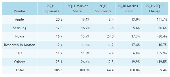 - 2011年第二季智能手機(jī)市場(chǎng)成長(zhǎng)了65.4%