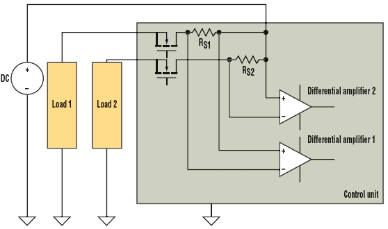 由于低端測量例子可能產生共模問題,這里考慮圖4所示的分布負載系統。虛線框中的控制單元使用MOSFET來控制輸送到兩個負載的功率。電源、負載和控制單元之間的寄生電阻RP1和RP2代表接地引線電阻和連接器電阻之和。在實際電路中,它們的數值可能為幾百毫歐。對于這個例子,假設RP1和RP2為0.2 Ω。差分放大器1和2與圖3中的差分放大器類似。