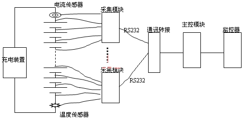 在電力系統(tǒng)變電站目前使用較多的蓄電池在線監(jiān)測(cè)裝置是電池巡檢儀,電池巡檢儀又分為兩種,一種是測(cè)量蓄電池單體電壓的巡檢儀,結(jié)構(gòu)是由一個(gè)主控模塊和數(shù)個(gè)采集模塊組成,主模塊接收監(jiān)控器的命令,發(fā)送電池?cái)?shù)據(jù)到直流設(shè)備的監(jiān)控器;采集模塊中每個(gè)模塊采集10~20節(jié)電池的電壓、電流和溫度;通過直流充電設(shè)備的監(jiān)控器可顯示各單節(jié)電池電壓,判斷故障電池的編號(hào)且給出報(bào)警。這類電池巡監(jiān)儀一般由直流設(shè)備生產(chǎn)廠家提供,在訂貨直流設(shè)備時(shí)它是選配裝置,由于功能單一、不能測(cè)試容量、且測(cè)量精度差、容易誤報(bào),限制了它的廣泛使用。測(cè)試示意圖如圖1: