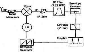 頻譜分析儀從頻譜測(cè)試的實(shí)現(xiàn)技術(shù)上可分為兩類:使用傅里葉變換(FFT)技術(shù)的數(shù)字頻譜分析儀和使用模擬濾波器的模擬頻譜分析儀(包括并行濾波器頻譜儀和掃頻式頻譜儀)。數(shù)字頻譜分析儀使用數(shù)值計(jì)算的方法處理一定時(shí)間周期的信號(hào),可提供頻率、幅度和相位信息,對(duì)周期信號(hào)和非周期信號(hào)均能分析。特點(diǎn)是速度快,精度高,適合分析窄帶信號(hào)。模擬頻譜分析儀的掃頻式頻譜分析儀是目前最常見(jiàn)的類型,在掃頻頻譜分析中普遍采用超外差式方式。掃頻式頻譜分析儀可分析穩(wěn)定和周期變化信號(hào),提供信號(hào)幅度和頻率信息,適合寬頻帶寬的快速掃描試驗(yàn)。Agilent的ESA系列經(jīng)濟(jì)型頻譜分析儀和HP8563等都屬于掃頻頻譜分析儀,其簡(jiǎn)化原理框圖見(jiàn)圖1,掃頻頻譜儀實(shí)際上是多級(jí)混頻結(jié)構(gòu)。這種分析方法最核心的部分是它的混頻器和中頻濾波器。混頻器將被測(cè)信號(hào)下變至中頻,然后在中頻上進(jìn)行處理,得到幅度。本地振蕩器采用掃頻振蕩器,它的輸出信號(hào)與被測(cè)信號(hào)中的各個(gè)頻率分量在混頻器內(nèi)依次進(jìn)行差頻變換,所產(chǎn)生的中頻信號(hào)通過(guò)中頻窄帶濾波器后再經(jīng)放大和檢波,加到視頻放大器作示波管的垂直偏轉(zhuǎn)信號(hào),使屏幕上的垂直顯示正比于各頻率分量的幅值。本地振蕩器的掃頻由鋸齒波掃描發(fā)生器所產(chǎn)生的鋸齒電壓控制,鋸齒波電壓同時(shí)還用作示波管的水平掃描,從而使屏幕上的水平顯示正比于頻率。