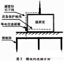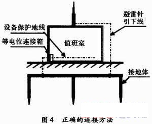 目前,關(guān)于共用接地有一種誤解,認(rèn)為將設(shè)備的接地引線無論怎樣連接,最終只要接在同一個接地體上就算是共用接地,如圖3所示。將“共引線”也誤認(rèn)為是“共地”。其實不然,所謂“共用接地”就是把許多不同性質(zhì)的接地裝置如電氣安全接地、交流電源工作地、通信及計算機(jī)直流地等匯集于一個等電位連接箱,使之成為一個等電位體,然后直接與接地體連接,而防雷地則通過另一條引下線與接地體連接。而不是將室內(nèi)設(shè)備接地與室外防直擊雷接地通過同一根引下線與地相連。更不允許將室內(nèi)接地引線與室外防直擊雷引線匯集與一個所謂的等電位連接箱,然后再與接地體相連。室內(nèi)接地引線要遠(yuǎn)離室外防雷引下線,如圖4所示。否則,遇雷擊時,強(qiáng)大的雷電流在通過引線向大地泄放的同時,室內(nèi)引線及所有設(shè)備上瞬間便會產(chǎn)生很高的電位差,設(shè)備難免遭到破壞。另外,假設(shè)與接地體相連的引線因銹蝕斷開或等電位連接端子接觸不良,一旦發(fā)生雷擊,強(qiáng)大的雷電流便會直擊至值班室設(shè)備上,這是非常危險的。
