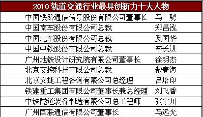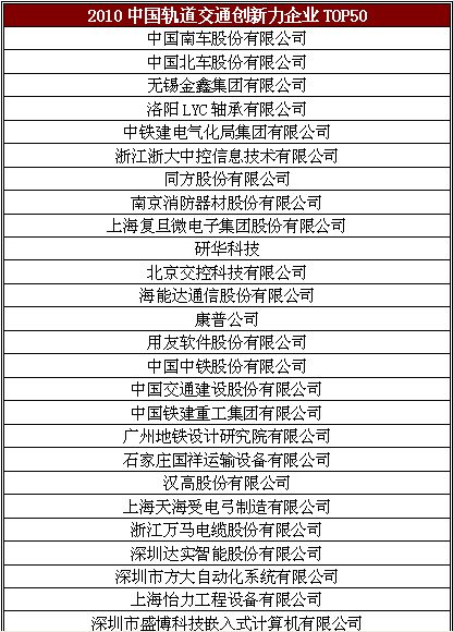2011年中國軌道交通行業步入一個井噴式發展的新階段,中國已經成為世界最大的軌道交通市場。眾多企業是如何與時俱進不斷創新?行業又該如何記錄那些不囿于桎梏勇于創新的先進?總結本年度在軌道交通行業勇于創新的企業和人物,由RT《軌道交通》雜志的主辦2011年度軌道交通創新力企業TOP50評價活動,將向業界隆重推出以智慧和膽識譜寫創新篇章的軌道交通先驅!