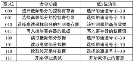 PC 機發送的控制字都是8 位的,其中高3 位為控制命令字,用來區分8 個命令,低5 位為輔助功能,具體見表3。FPGA 接收到主機發來的命令信號后,按命令執行相應的操作。