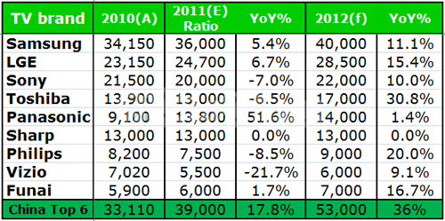 而今年Sharp以日本市場為主軸;Toshiba以日、歐為主要銷售地區(qū),年成長表現(xiàn)衰退;Sony銷售地區(qū)橫跨歐、美、日,除了區(qū)域性需求不振,加上其組織策略反映較緩慢,不僅財(cái)報(bào)未見起色,年度液晶電視出貨目標(biāo)更呈現(xiàn)7%之衰退,下修至20百萬臺(tái);Panasonic因購買Sanyo品牌,看似整體市占率提升,但內(nèi)部獲利壓力頗大,除打算出售位于日本茂原的六代廠,亦將減少8.5代廠的產(chǎn)能,后續(xù)仍須觀察;Philips以歐洲為主要市場,難幸免于歐債風(fēng)暴沖擊;Vizio面臨與LGD之合作關(guān)系生變,加上北美市場不景氣,年度銷售量下滑幅度甚鉅;反觀大陸品牌挾帶雄厚資源,年度銷售量成長依舊維持在17~18%左右,市占率更達(dá)19~20%,2012更預(yù)估有3成之成長力道。