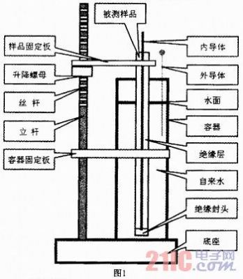 將被測樣品下端用絕緣物質封住端口,放入盛有自來水的容器,利用樣品固定板將樣品固定。由于水是導電液體,流動性好,能夠均勻地包裹在絕緣層外面,在水中插入一根導線(裸銅線),相當于在絕緣層外增加一個電極。將電容測試儀的測量夾,分別連接到內外兩個導體,即可測量外導體和內導體之間的電容值。