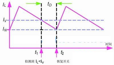 一般而言,通常采用比較器來檢測IL是否超出IV,以決定關斷或重新開通。可是,比較器會帶來延時tD,影響閾值的有效值。如圖2所示,比較器在t1時刻檢測到IL< p> V,可是偶遇延時tD,開關會在t2時刻被恢復?;谶@個原因,有效閥值IN便會低于IV,這樣,實際的輸出IOUT(CL)為: