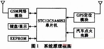 當(dāng)車(chē)主離開(kāi)車(chē)輛時(shí),即可啟動(dòng)防盜系統(tǒng),首先車(chē)主需設(shè)置手機(jī)號(hào),以備接收車(chē)輛的定位信息,此時(shí),單片機(jī)控制GPS模塊,不斷獲取GPS定位數(shù)據(jù),并對(duì)獲取的GPS數(shù)據(jù)進(jìn)行分析,從而獲取包括車(chē)輛的經(jīng)、緯度以及速度等信息。系統(tǒng)通過(guò)車(chē)輛的速度或經(jīng)、緯度的變化來(lái)判斷車(chē)輛是否被移動(dòng),如果車(chē)輛被非法移動(dòng),單片機(jī)將控制GSM模塊將車(chē)輛的定位信息通過(guò)短消息,以每間隔十分鐘時(shí)間發(fā)送到車(chē)主指定的手機(jī)中,同時(shí),單片機(jī)將此信息存儲(chǔ)在EEPROM中,以做將來(lái)的證據(jù)使用。車(chē)主第一時(shí)間知道車(chē)輛位置后,即可通過(guò)GSM遠(yuǎn)程網(wǎng)絡(luò)控制防盜系統(tǒng),切斷車(chē)輛的點(diǎn)火電路,使車(chē)輛熄火。同時(shí),車(chē)主將車(chē)輛定位信息提供給警方,盡快找回自己的車(chē)輛。系統(tǒng)工作原理框圖見(jiàn)圖1。